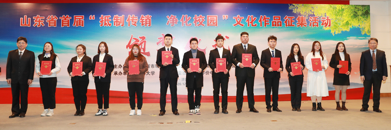 12月22日下午,山东省首届“抵制传销 净化校园”文化作品征集活动颁奖仪式在beat365举办。山东省市场监督管理局一级巡视员桂敦山、山东省教育厅副厅长戴龙成、山东省公安厅经济犯罪侦查总队总队长徐磊、学校党委副书记王玉华、副校长杨景波、山东省教育厅学校安全管理处处长魏治法、山东省打击传销联席会议办公室主任李冠博、山东省公安厅经济犯罪侦查总队一级警长刘秀子、济南市市中公安分局七贤派出所副所长戴兵出席颁奖仪式。学校办公室、党委宣传部、党委学生工作部(处)、党委保卫部 安全管理处、后勤管理与基建处、团委等部门主要负责人和来自全省30所高校的主创团队、指导教师、校方代表以及新闻媒体共同参加颁奖活动。