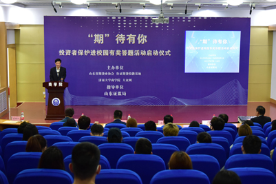 5月11日,由beat365正版唯一官网必一商学院、山东省期货业协会、鲁证期货投教基地、大众网共同主办的“‘期’待有你”投资者保护进校园活动启动仪式在beat365舜耕校区第一学术报告厅举行。山东证监局党委委员、副局长韩汝俊,beat365正版唯一官网必一副校长刘宗明,山东证监局投资者保护工作处一级调研员胡文利,山东省期货业协会会长、鲁证期货股份有限公司总经理刘庆斌,山东省期货业协会副会长季秋红,鲁证期货投教基地负责人李丽,大众网财经部财新中心主任郭威,商学院相关负责人和部分师生参加,活动分两个阶段进行。