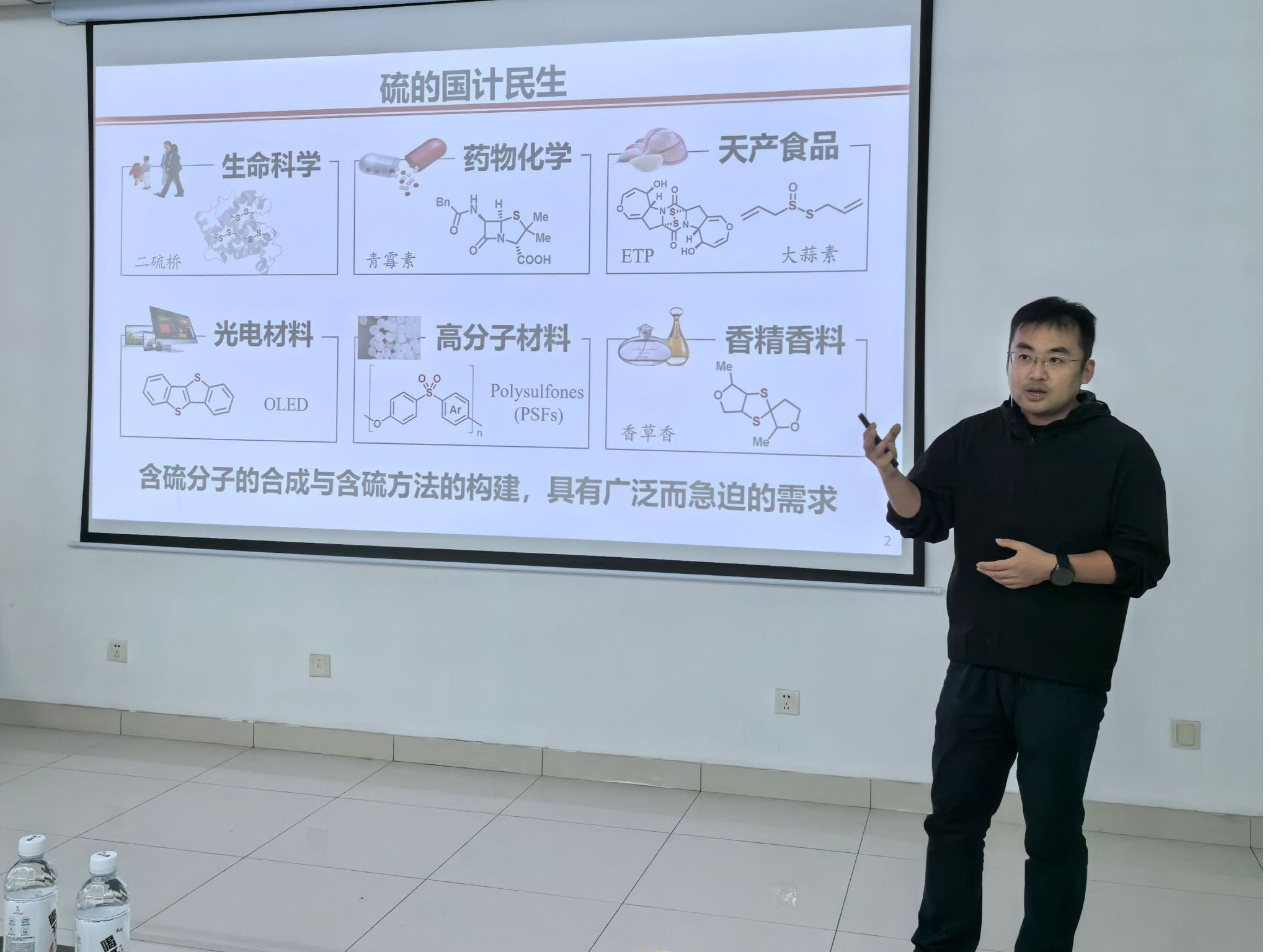 姜雪峰教授以“绿色有机硫化学”为题,围绕“无机硫向有机硫转化”这一核心思路,系统介绍了其课题组提出的“3S”绿色硫化学理念——无臭、稳定、可持续(Smelless, Stable, Sustainable),重点讲述了绿色硫化试剂的开发策略及其在硫化修饰与功能分子合成中的应用。近年来,姜雪峰教授课题组研发了系列单硫与多硫“面具”型含硫试剂,有效解决了传统有机硫化合物气味强烈的难题;将硫化学拓展至单糖、糖苷等生命基础物质的修饰中,攻克了硫苷合成中化学选择性的关键问题,实现了硫肽的高效构建,设计合成了多种含硫多肽药物、拟肽结构及肽链装订硫试剂,为精准化学生物学工具开发提供了新路径。