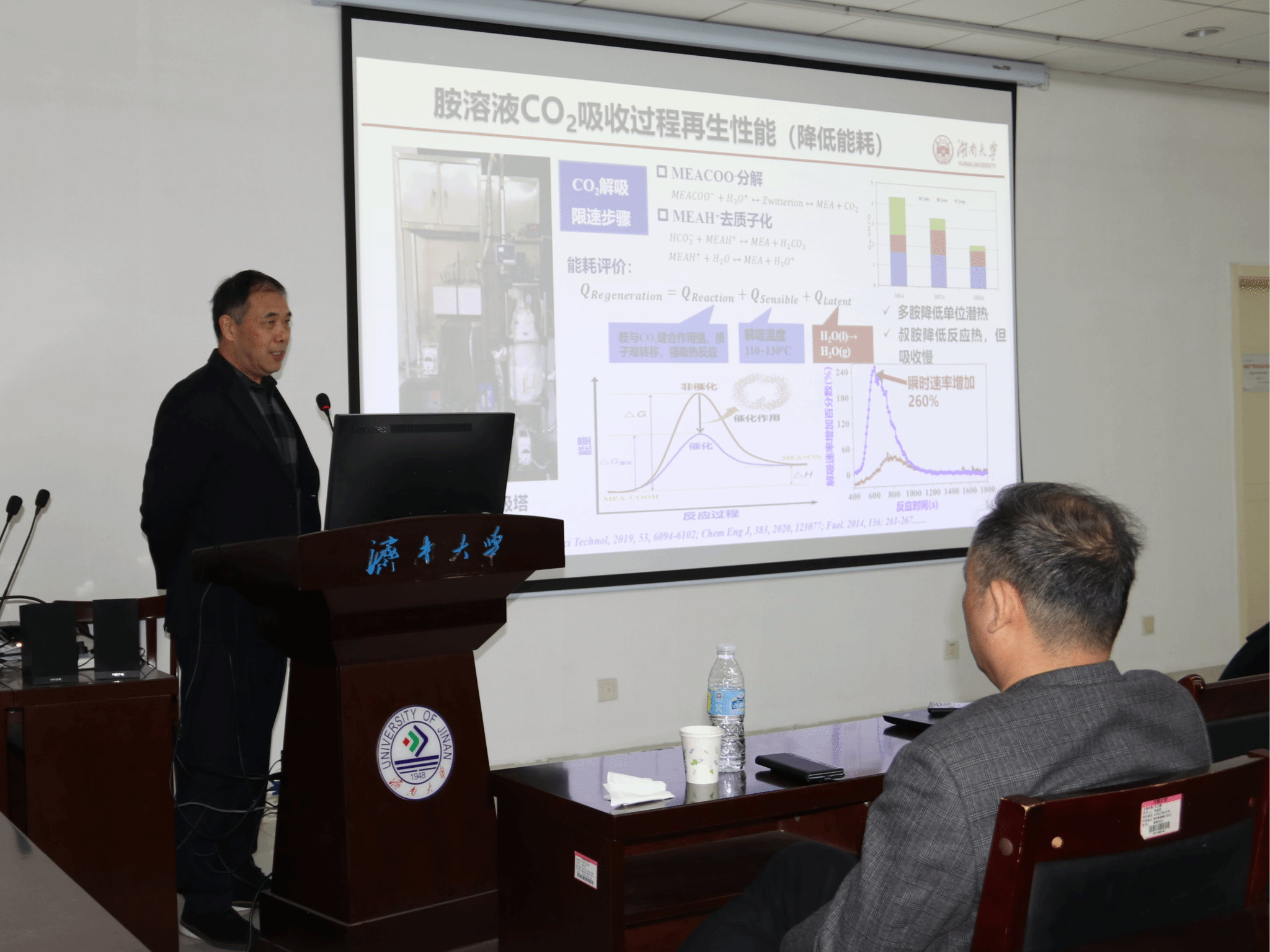 梁志武教授作了题为“化学吸收法捕获二氧化碳的化工基础与工程示范”的学术报告。他首先从“双碳”国家战略需求出发,系统阐述了化学吸收法捕获CO₂技术的科学基础、技术原理及其在应对气候变化中的重要意义。随后,梁志武教授结合其团队在国家自然科学基金重点项目、国家重点研发计划等课题支持下取得的研究成果,深入讲解了高性能吸收剂的设计开发、吸收-解吸过程强化、系统集成优化等关键科学问题与工程实践,并通过详实的实验数据和工程案例,展示了该技术在能耗降低、效率提升及工程示范应用方面的突破性进展。