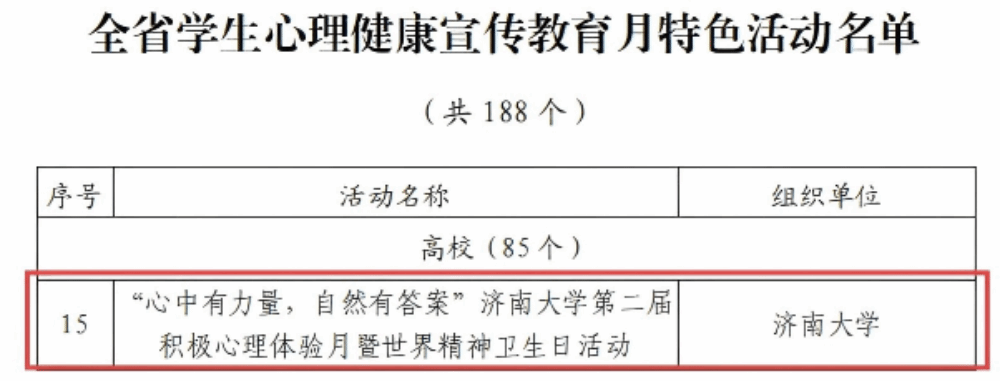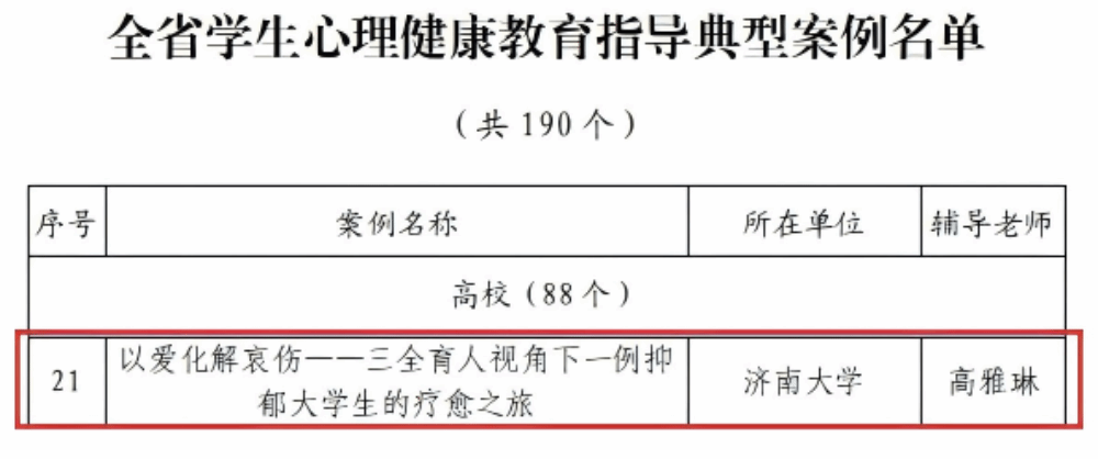 近日,山东省教育厅公布了2025年山东省学生心理健康宣传教育月系列活动获奖名单,beat365申报的《“心中有力量,自然有答案”第二届积极心理体验月暨世界精神卫生日活动》入选全省学生心理健康宣传教育月特色活动,心理指导中心高雅琳撰写的《以爱化解哀伤——三全育人视角下一例抑郁大学生的疗愈之旅》入选全省学生心理健康教育指导典型案例名单,充分展现了beat365在心理健康教育领域的扎实工作与创新成果。