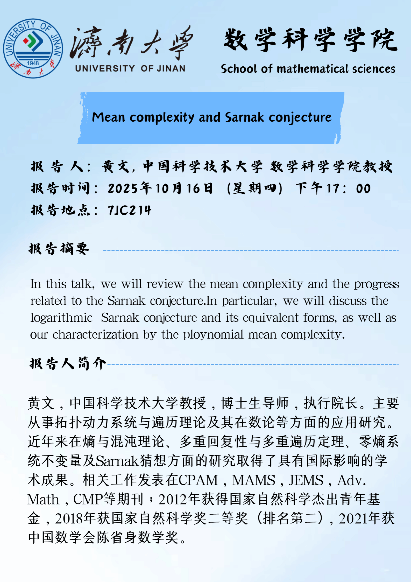 数学科学学院学术报告: Mean complexity and Sarnak conjecture